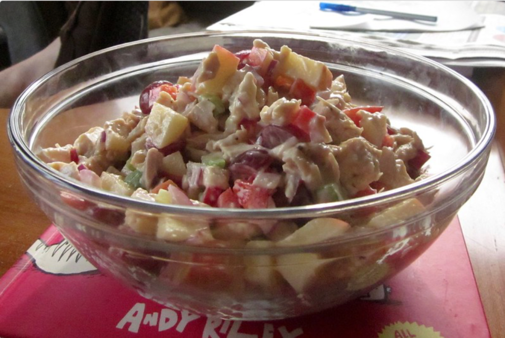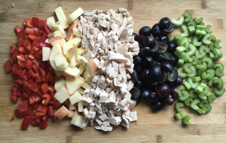 - Dice the chicken, grapes, apple, red pepper, celery and garlic.