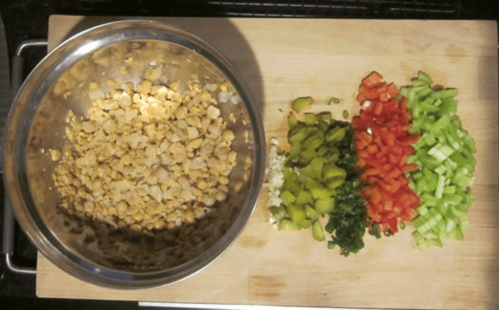 - In a large bowl, mash the chickpeas until flaked in texture.