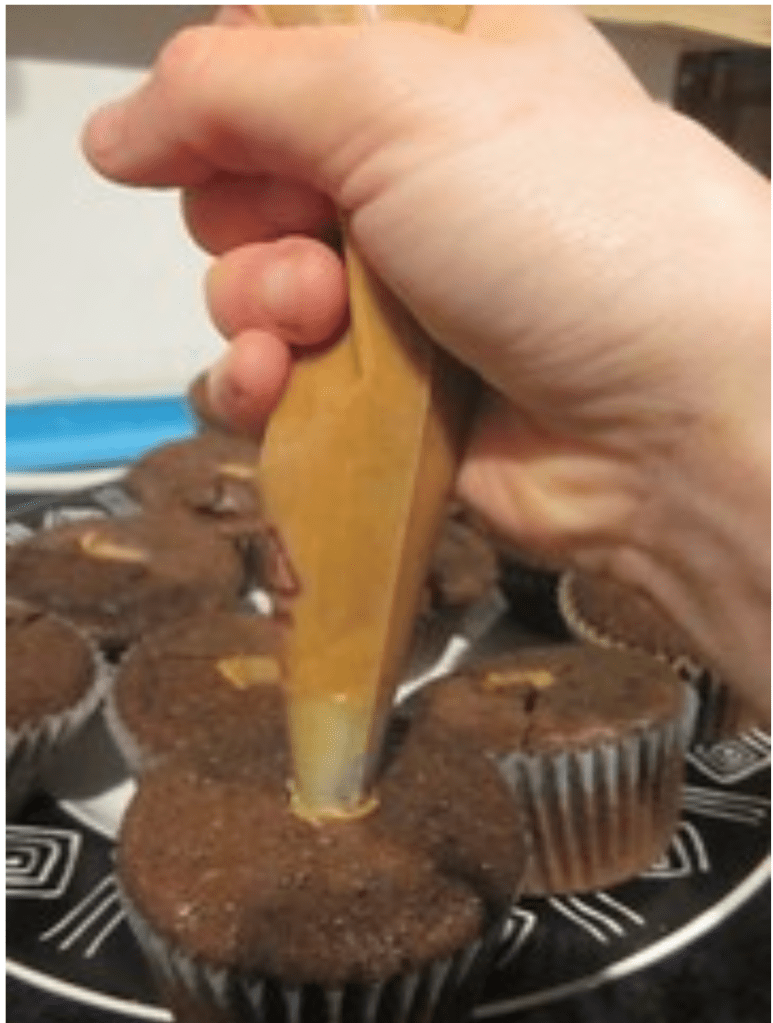 - Spoon filling into a pastry bag fitted with a star tip. Holding a cupcake, plunge the tip into the top of the cake and gently squeeze.