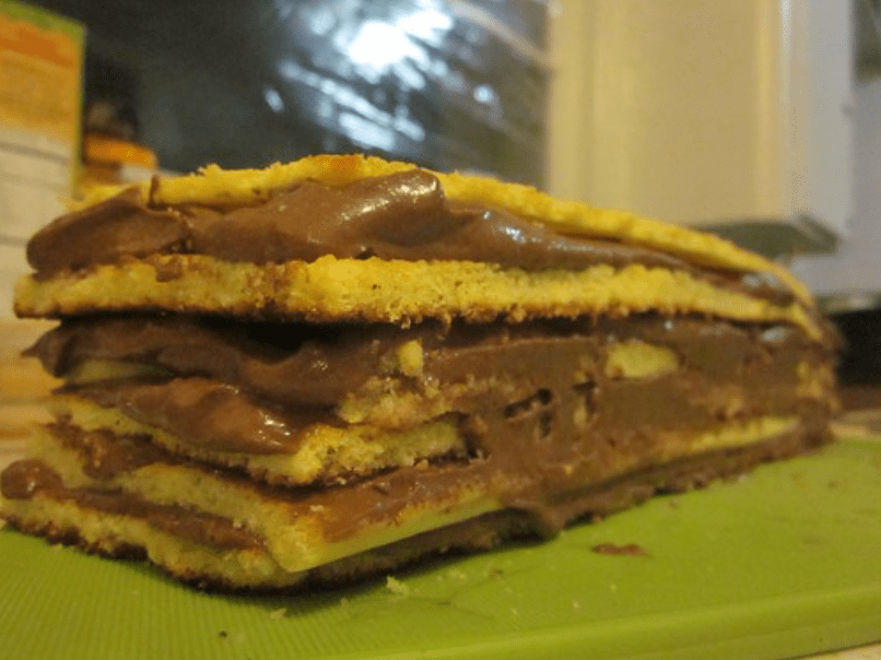 - Place one cake layer, golden side up on a platter. Brush with brandy and then spread filling evenly on top.