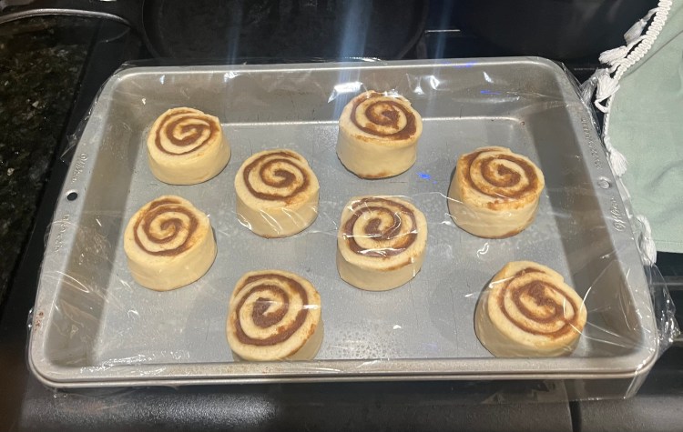 - Roll the dough into a log and with seam side down cut into 12 equal slices. Place rolls into cake pan, cover loosely with plastic wrap and let rise in a warm spot 45-85 minutes.