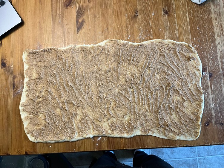 - Roll the dough into a 12″x20″ rectangle. Spread the filling over the dough.