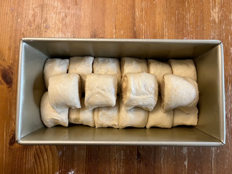 - In the loaf pan, place two rows of six pieces, seam down with the swirls facing the end of the pan.