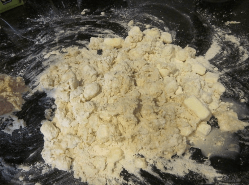 - In a mixing bowl, combine the frozen butter and dry ingredients with a pastry blender until mixture crumbles to the size of peas.