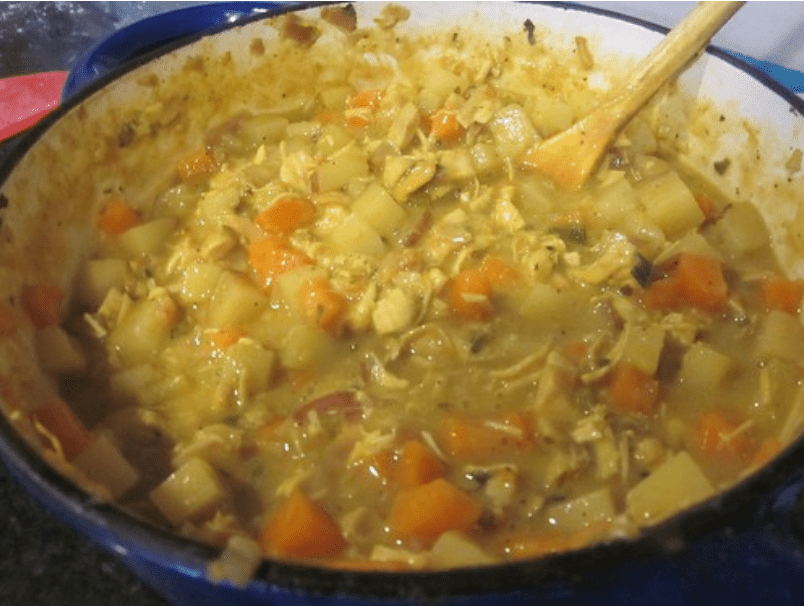 - Add the carrots, potatoes, scallions, cilantro, celery, thyme, sage, salt, cayenne, and the chicken. Continue to saute for 2 minutes.
