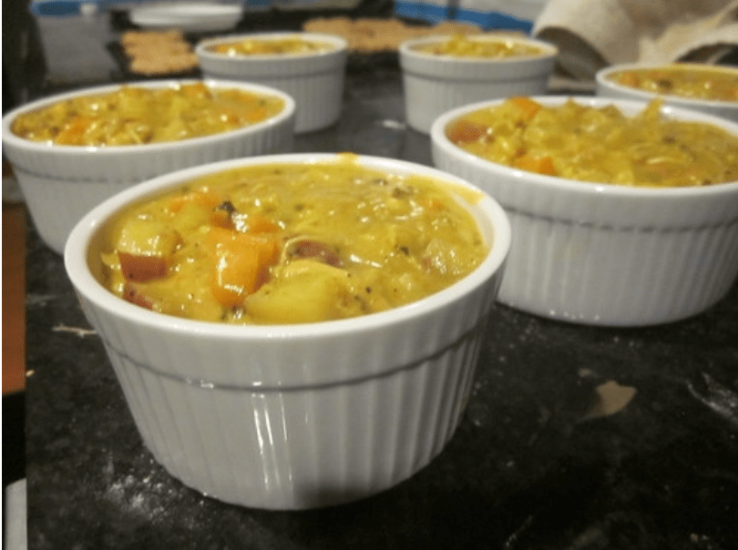 - In the same pot, add the butter, garlic, onion, ginger, jalapeno and curry powder. Saute for 5 minutes or until the curry turns a dark golden brown.