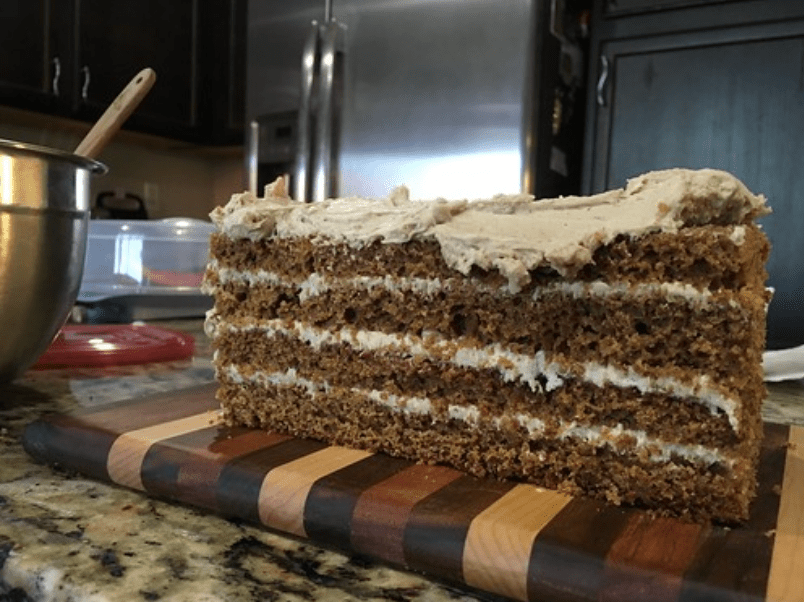 - Place one cake onto a plate, spread it with frosting and repeat until you have five slices of cake sandwiched together.