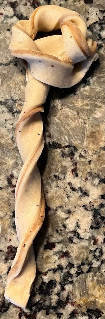 - Make a slit up the center of the dough strip, leaving 3/4″ at the top intact.