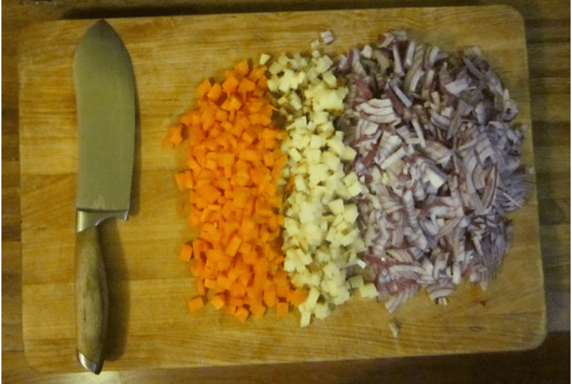 - Cut onion, carrots and potato into really small pieces and then add to pot.