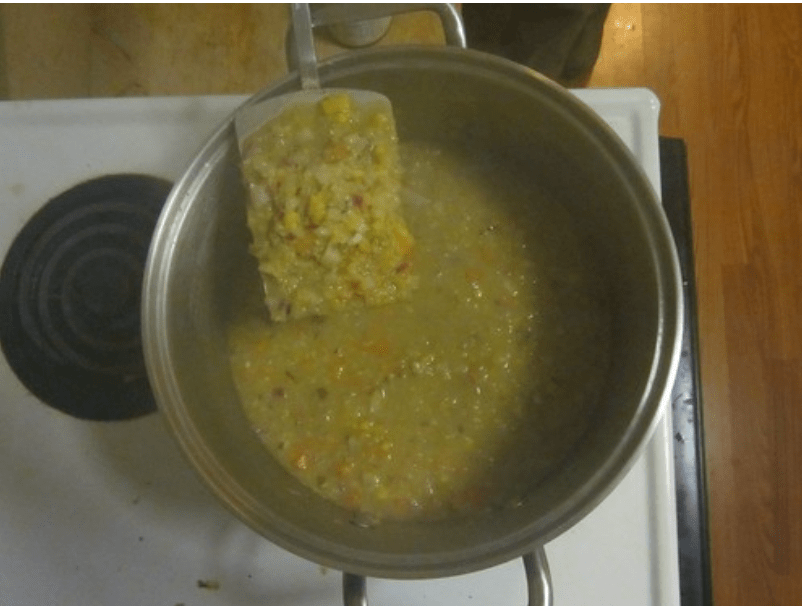 - Slowly add to veggie stock to pot, 2 cups at a time. See picture for desired finished texture.