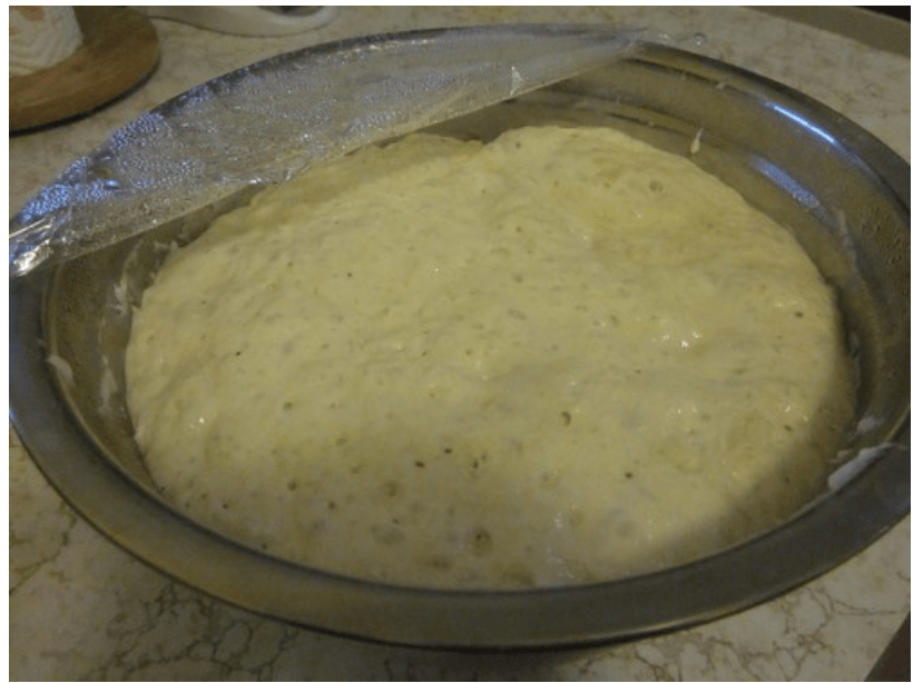 - Stir the yeast and flour in a large mixing bowl. Add the water and stir until all ingredients are blended. Cover with plastic wrap and allow to rise for two hours.