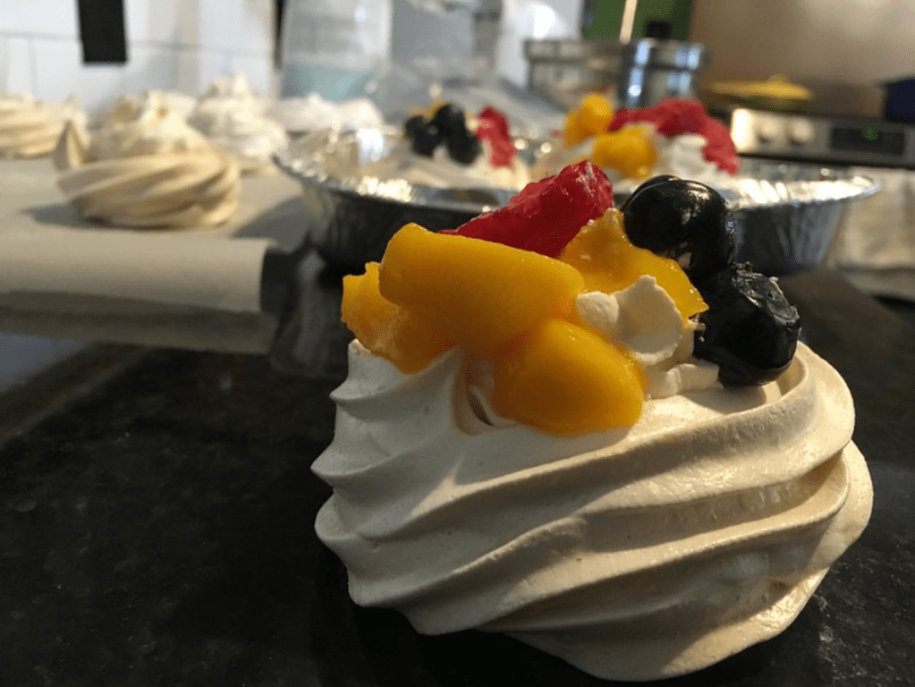 - Just before serving, spread whipped cream over the pavlova and top with plenty of your favorite fruit.