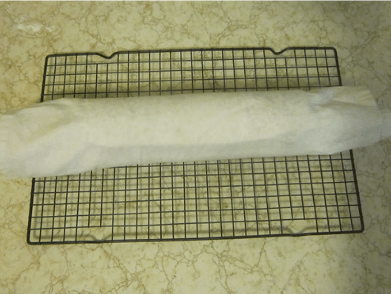 - When cake is done, immediately flip it onto your kitchen towel, roll it up with the towel, and leave to cool on a wire rack.