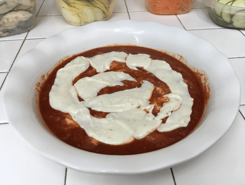 - Oil your baking dish and spread a layer of the tomato sauce and then a layer of the béchamel sauce on top.