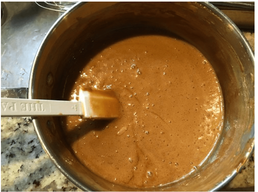 - The batter will turn a nice dark orange/brown color (see photo). Remove from heat and add in the vanilla extract, mixing to combine. Let this mixture cool for approximately 10 minutes.