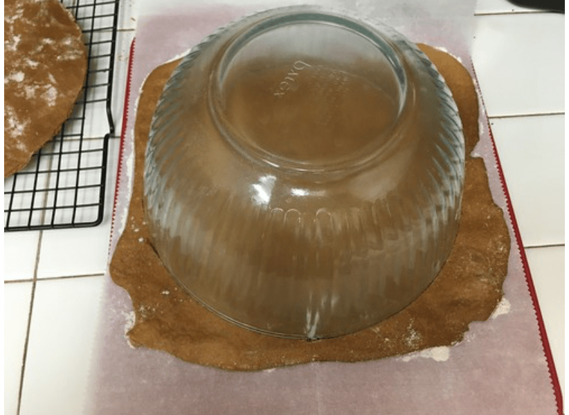 - Remove the first piece from the oven and place on a flat surface to cool slightly. Then cut the piece down to the final shape (I used a bowl that I traced with a knife) You want to do this while the dough is still a little warm! Save the scraps for decorating.