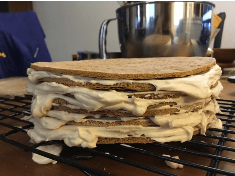 - Assemble the cake by spreading a layer of cream between each cake disc, stacking to form one cake.