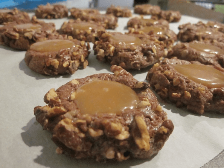 - Fill each cookie with 1/2 teaspoon caramel mixture.
